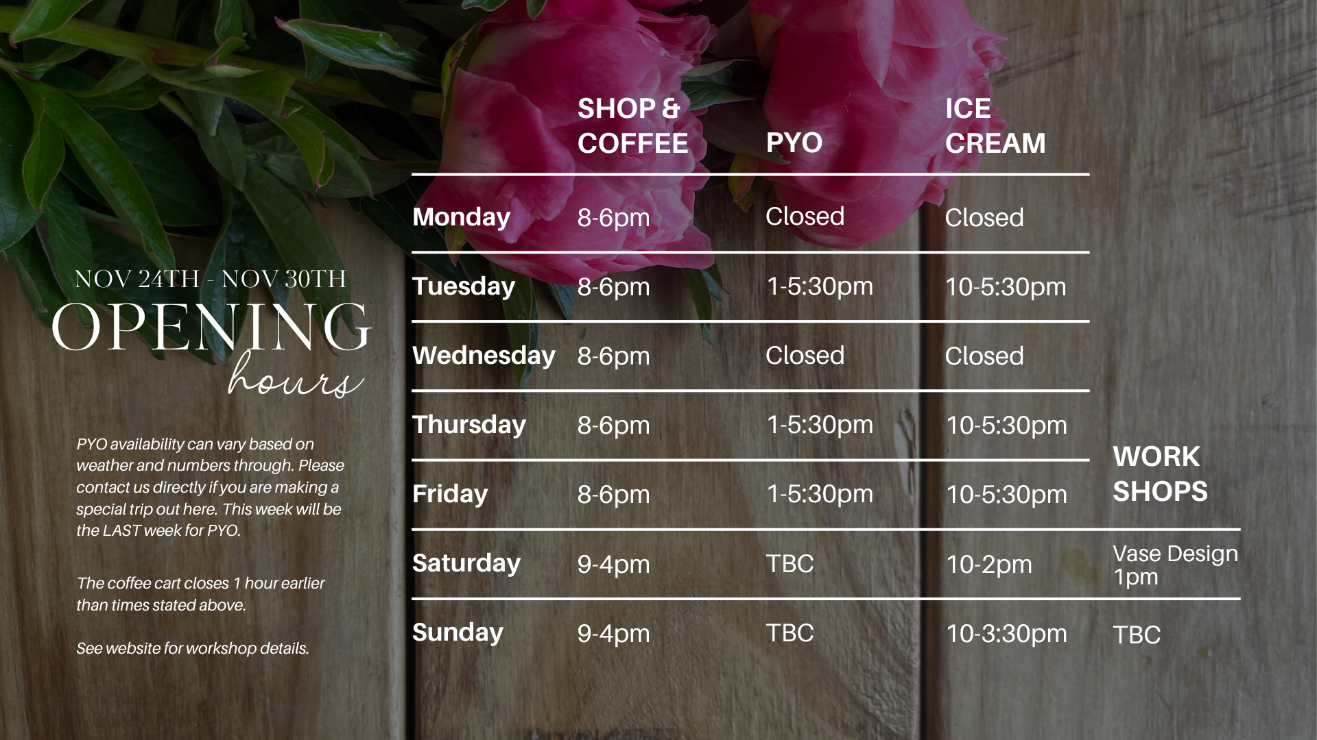 Closed Monday and Tuesday from December 1st.